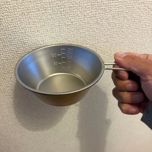 スノーピーク シェラカップ。直火OKのステンレス製と軽量なチタン製があります。正確な目盛りは、お米を炊くときや料理の計量に本当に重宝するバイ!