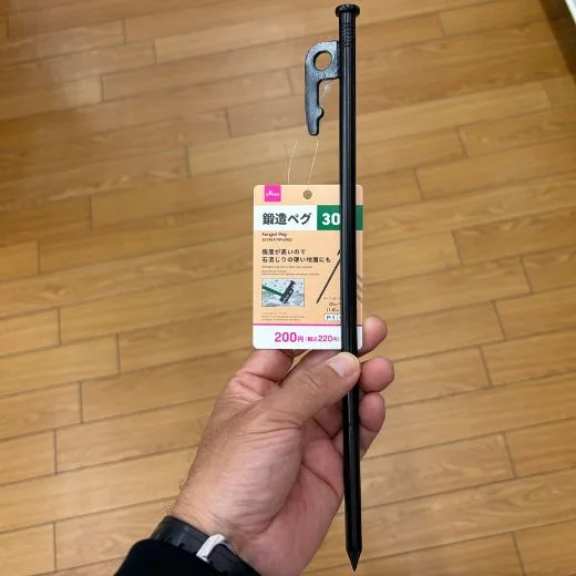 最近はダイソーから「鍛造ペグ」が出ています。これは強度が凄まじく、100均で揃えるならこれが大正解バイ!