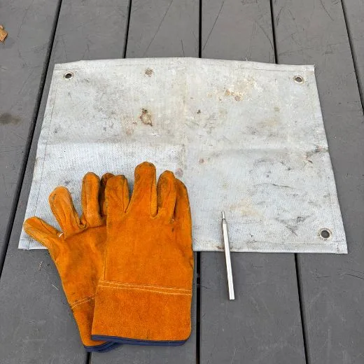 ワークマンや100均の革手袋で十分。汚れや焦げを気にせず、ガシガシ使い倒せるのが魅力バイ。