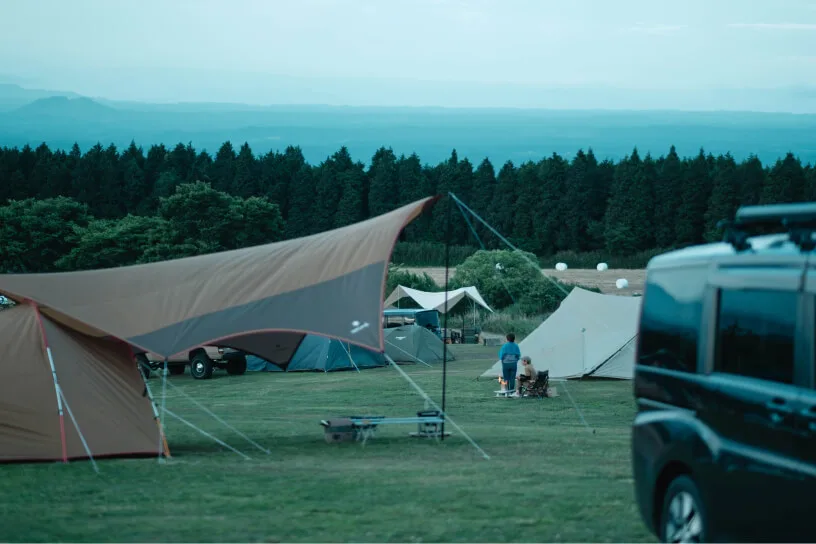 ボイボイキャンプ場は完全フリースペースのオートキャンプ場です。九重連山を背景に、どこに停めても愛車が絵になる「映え」の聖地。全面芝生で気持ちいいですが、スタンドが沈まないようプレートを忘れずに。朝、テントのジッパーを開けた瞬間のくじゅうの山並みは、何物にも代えがたい感動があります。ボイボイキャンプ場公式サイトはこちらから。