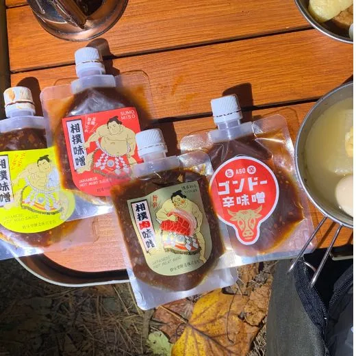 最近キャンプ界隈で人気の柳川市の鶴味噌醸造の「相撲味噌」とCAMP TEBAの「幸タレ」。これがあればどんな料理もおいしくいただける優れものです(^^♪