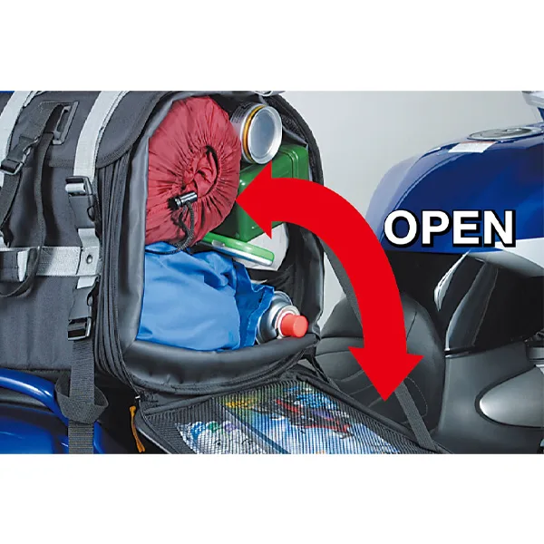 | 積載の裏技 | 天面巾着で数値以上の収納力 | 天面フラットで重ね積みに強い | リュックとして背負える |